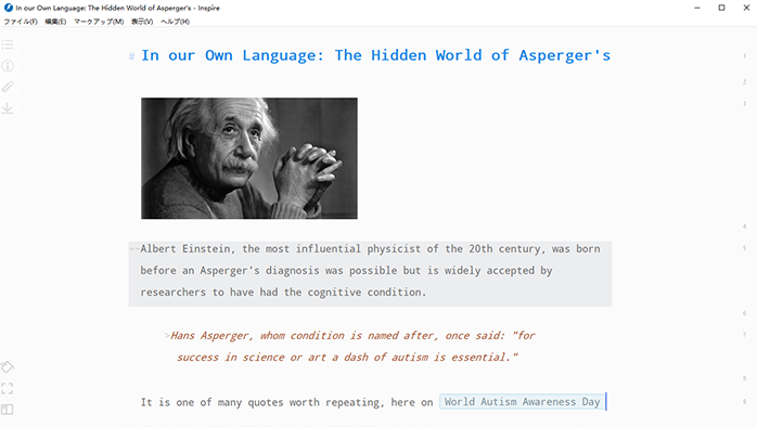 Inspire は軽量で使いやく、シンプルな Markdown エディターです。落書き、メモ、ブログ文章または小説を書く、あなたをライティングに集中していただくことは Inspire の使命です。