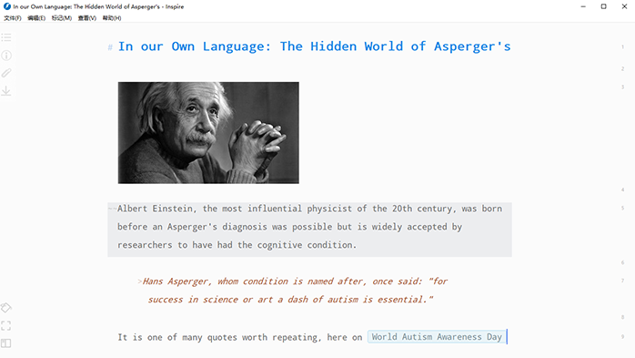 Inspire 给你一个无干扰的、轻量级的 markdown 写作环境,提升写作效率。无论是便笺笔记、博客文章还是小说创作,你只需要聚焦内容,其它的都交给 Inspire。